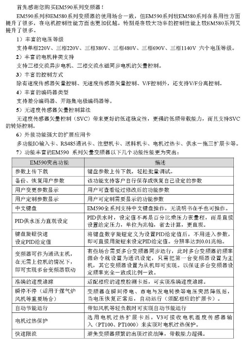 EM590系列變頻器是歐華傳動(dòng)公司自主研發(fā)的無速度傳感器矢量控制通用型變頻器,采用了先進(jìn)的矢量控制算法,適用于大部分應(yīng)用場合。參數(shù)簡明,可配置全中文操作鍵盤,操作簡單,功能豐富,對(duì)負(fù)載適應(yīng)能力超強(qiáng),無需專業(yè)知識(shí)便可輕松實(shí)現(xiàn)調(diào)試。